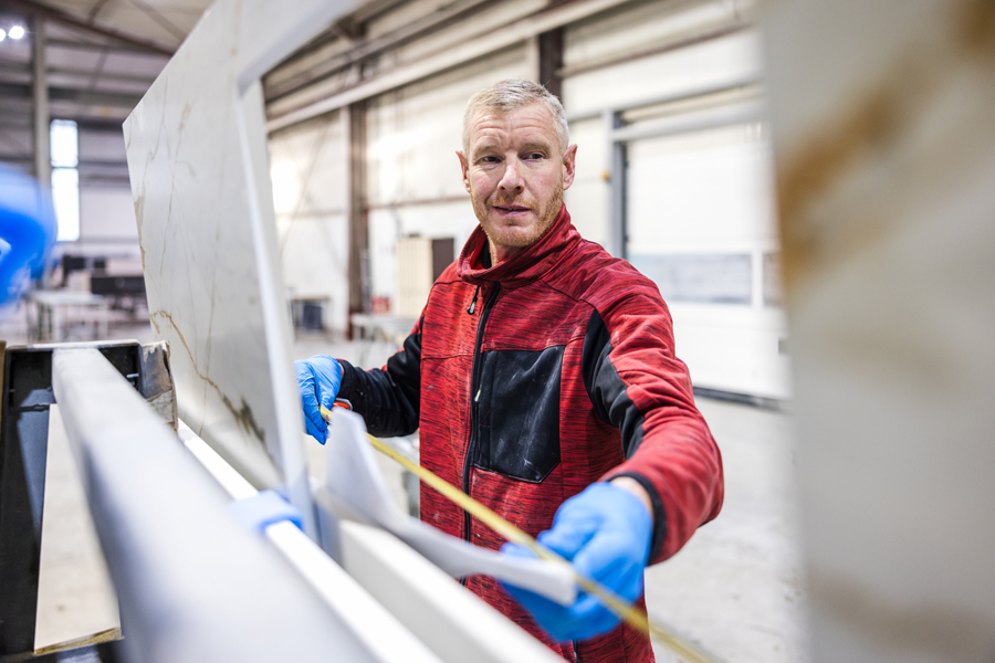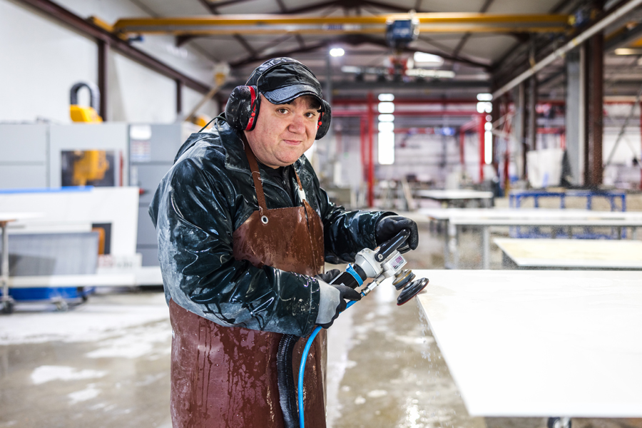 assure la finition des surfaces en pierres naturelles, quartz ou céramique selon l’aspect final voulu par les clients. Il met en valeur l’éclat et la brillance de la pierre grâce à un polissage manuel ou automatique d’une grande précision.